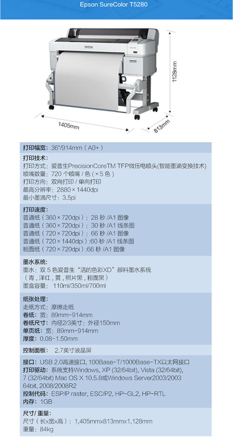 愛普生(EPSON)SureColor T5280 36英寸 A0+幅面 大幅面打印機(jī)
